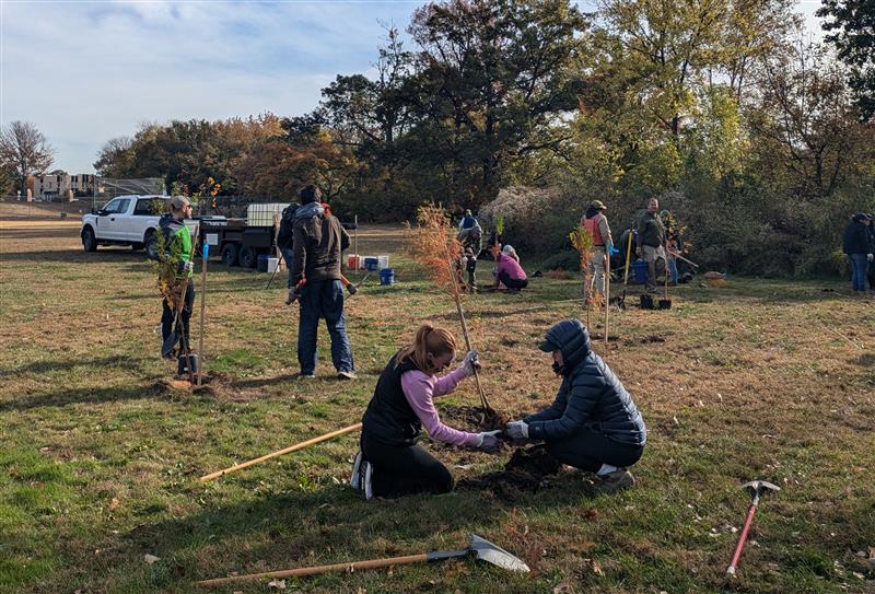 Volunteers joined the Conservancy to plant 181 trees and 20 shrubs near Rockland and Ormiston Mansions in East Fairmount Park. Plantings at legacy sites like this support long-term ecological restoration goals that strengthen native biodiversity in our parks. Special thanks to the Arbor Day Foundation and Truist Financial for bringing over a dozen volunteers to support this project!